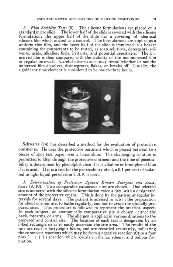 22 JOURNAL OF THE SOCIETY OF COSMETIC CHEMISTS •t. Radioisotope Studies with Silicone C-l•t (11). In view of the quick dissipation of energy of C-14 beta, one cannot rely entirely on measure- ments made over the skin surface, although, if all physical conditions are constant, an experienced investigator can compare the afforded protection of two or several products with a reasonable degree of reproducibility. For the most accurate determination, it is necessary to excise a small section of skin of a given size, cornbust this, and determine the activity in the evolved carbon dioxide through precipitation as barium carbonate, counting in a flow gas counter or equivalent. 5. Clinical Protection against Contact Dermatitis by patients with dermatitis venenata due to soaps, alkalies, detergents, and household and industrial contactants. Patients are diagnosed as dermatitis venenata particularly of the hands. The majority of the patients are patch tested and the eczematous-producing allergen determined. The patient is then treated with antiseptic sgak s, soothing ointment, and superficial x-ray ther- apy when necessary. Th• pgtient is then advised to use the silicone formu- lation two to three times a day. The patient is requested to gradually cease using the protective rubber gloves with cotton insert. If the physiology of the skin of the hands returns to normal, then household and/or industrial chores are continued. Birmingham (15) re-emphasizes that prolonged action of alkali agents in soaps and detergents tends to neutralize the acid mantle of the skin. They also break down the keratin, to release sulfhydryl groupings. With con- tinuous exposure to the alkali the restoration of the acid mantle is inhibited, and thus the epidermal defenses against allergenic agents is weakened. Anderson (16) and Sharlit (17) offer some valuable and original ideas re- garding the protective action of the acid medium of the skin. The lipid content of the skin also acts as a protective barrier. After many trials, it was decided to disperse various viscosities of the Velvasil fluids in a greaseless base which resembles the pH of the skin, namely around 5.0, to restore and maintain the acid mantle. The viscosi- ties (in centistokes) which were evaluated were 100, 1000, 10,000, and 100,- 000. The concentrations of the silicones were 20, 10, 5, and 2 per cent. The alcohol-soluble Velvasil was dispersed in a homogeneous neutral emul- sion because of its possible cosmetic applicability. The following formulas were utilizect in this evaluation: A. Tween 60 ....................................... 2.0 Citric Acid ..................................... 2.0 Velvasil Silicone Fluid ............................ 10.0 Hydrophilic Ointment (U.S.P.), q. s. ad ............. 100.0 B. Tween 60 ....................................... :2.0 Velvasil Alcohol Soluble Fluid ..................... 10.0 Emulsion Triethanolamine Stearate, q. s. ad ......... 100.0 Forty patients visited our office for dermatological consultation because of a dermatitis involving the hands. These patients presented an erythema-