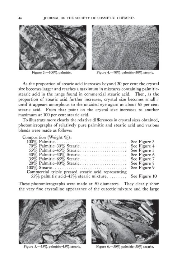 PHYSICAL CHEMICAL PROPERTIES OF STEARIC ACID 43 •0 ß 68 o 66 • 64 • 62 • 6o • 5s [• 56 54 0 10 20 30 40 50 60 70 80 90 100 MOL % STEARIC ACiD Figure 1.--Mol % stearic acid vs. melting point. 0 10 20 30 40 50 60 70 80 90 100 WEIGHT % STEARIC ACID Figure 2.--Weight % steric acid vs. crystal .qlZC. 62.9øC. to about 55øC. This is the point of lowest melting for any mixture of these two fatty acids and is ordinarily referred to as the eutectic. As the stearic acid proportion is increased to about 50 mol per cent, the melting point gradually rises to about 58øC. Commercial stearic acid containing 55 per cent palmitic-45 per cent stearic (weight basis) falls in this section of the curve. On a mol basis this is equivalent to about 57.5 per cent palmitic-42.5 per cent stearic as there is only about 10 per cent difference in molecular weight between these two fatty acids. As the proportion of stearic acid is increased from 50 to 100 mol per cent, the melting point increases sharply to 69.9øC. From this curve it is apparent that mixtures in the range of approximately 70 per cent palmitic-30 per cent stearic acid to 50 per cent palmitic-50 per cent stearic (tool per cent) have properties different from those of mixtures containing higher or lower percentages. Other physical-chemical measurements are of interest and serve to sup- port the evidence obtained from the melting-point curves. SIZE OF CRYSTALS Pure palmitic and stearic acids have comparatively large-sized crystals. Under a given set of conditions, crystals of palmitic acid are larger than those of stearic acid. The relationship between crystal size of mixtures containing various proportions of palmitic and stearic acid is shown in Figure 2, "Weight Per Cent Stearic Acid rs. Crystal Size." Crystal sizes are given qualitatively as they were not determined by actual measure- ment. As the proportion of stearic acid in palmitic is increased from 0 to about 30 per cent (weight) the crystal size becomes smaller. At the eutectic they are so small they appear amorphous or noncrystalline to the unaided eye.