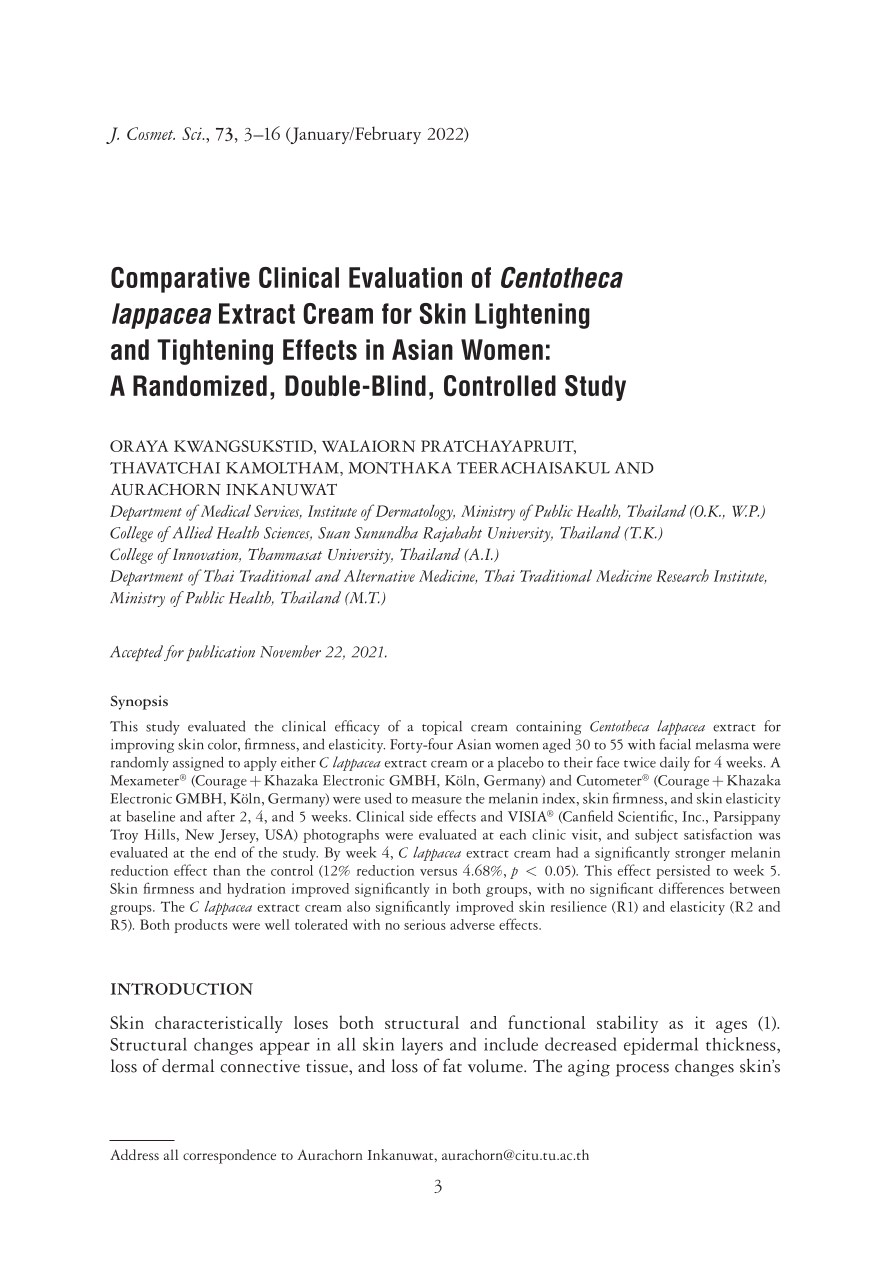 3 Address all correspondence to Aurachorn Inkanuwat, aurachorn@citu.tu.ac.th Comparative Clinical Evaluation of Centotheca lappacea Extract Cream for Skin Lightening and Tightening Effects in Asian Women: A Randomized, Double-Blind, Controlled Study ORAYA KWANGSUKSTID, WALAIORN PRATCHAYAPRUIT, THAVATCHAI KAMOLTHAM, MONTHAKA TEERACHAISAKUL AND AURACHORN INKANUWAT Department of Medical Services, Institute of Dermatology, Ministry of Public Health, Thailand (O.K., W.P.) College of Allied Health Sciences, Suan Sunundha Rajabaht University, Thailand (T.K.) College of Innovation, Thammasat University, Thailand (A.I.) Department of Thai Traditional and Alternative Medicine, Thai Traditional Medicine Research Institute, Ministry of Public Health, Thailand (M.T.) Accepted for publication November 22, 2021. Synopsis This study evaluated the clinical efficacy of a topical cream containing Centotheca lappacea extract for improving skin color, firmness, and elasticity. Forty-four Asian women aged 30 to 55 with facial melasma were randomly assigned to apply either C lappacea extract cream or a placebo to their face twice daily for 4 weeks. A Mexameter® (Courage + Khazaka Electronic GMBH, Köln, Germany) and Cutometer® (Courage + Khazaka Electronic GMBH, Köln, Germany) were used to measure the melanin index, skin firmness, and skin elasticity at baseline and after 2, 4, and 5 weeks. Clinical side effects and VISIA® (Canfield Scientific, Inc., Parsippany Troy Hills, New Jersey, USA) photographs were evaluated at each clinic visit, and subject satisfaction was evaluated at the end of the study. By week 4, C lappacea extract cream had a significantly stronger melanin reduction effect than the control (12% reduction versus 4.68%, p 0.05). This effect persisted to week 5. Skin firmness and hydration improved significantly in both groups, with no significant differences between groups. The C lappacea extract cream also significantly improved skin resilience (R1) and elasticity (R2 and R5). Both products were well tolerated with no serious adverse effects. INTRODUCTION Skin characteristically loses both structural and functional stability as it ages (1). Structural changes appear in all skin layers and include decreased epidermal thickness, loss of dermal connective tissue, and loss of fat volume. The aging process changes skin’s J. Cosmet. Sci., 73, 3–16 (January/February 2022)