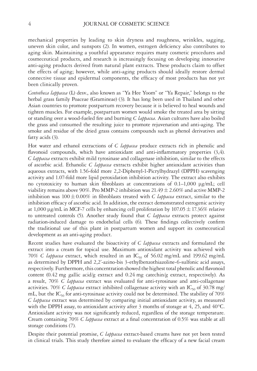 4 JOURNAL OF COSMETIC SCIENCE mechanical properties by leading to skin dryness and roughness, wrinkles, sagging, uneven skin color, and sunspots (2). In women, estrogen deficiency also contributes to aging skin. Maintaining a youthful appearance requires many cosmetic procedures and cosmeceutical products, and research is increasingly focusing on developing innovative anti-aging products derived from natural plant extracts. These products claim to offset the effects of aging however, while anti-aging products should ideally restore dermal connective tissue and epidermal components, the efficacy of most products has not yet been clinically proven. Centotheca lappacea (L) desv., also known as “Ya Hee Yoom” or “Ya Repair,” belongs to the herbal grass family Poaceae (Gramineae) (3). It has long been used in Thailand and other Asian countries to promote postpartum recovery because it is believed to heal wounds and tighten muscles. For example, postpartum women would smoke the treated area by sitting or standing over a wood-fueled fire and burning C lappacea. Asian cultures have also boiled the grass and consumed the resulting juice to promote rejuvenation and anti-aging. The smoke and residue of the dried grass contains compounds such as phenol derivatives and fatty acids (3). Hot water and ethanol extractions of C lappacea produce extracts rich in phenolic and flavonoid compounds, which have antioxidant and anti-inflammatory properties (3,4). C lappacea extracts exhibit mild tyrosinase and collagenase inhibition, similar to the effects of ascorbic acid. Ethanolic C lappacea extracts exhibit higher antioxidant activities than aqueous extracts, with 1.56-fold more 2,2-Diphenyl-1-Picrylhydrazyl (DPPH) scavenging activity and 1.07-fold more lipid peroxidation inhibition activity. The extract also exhibits no cytotoxicity to human skin fibroblasts at concentrations of 0.1–1,000 μg/mL cell viability remains above 90%. Pro MMP-2 inhibition was 21.49 ± 2.60% and active MMP-2 inhibition was 100 ± 0.00% in fibroblasts treated with C lappacea extract, similar to the inhibition efficacy of ascorbic acid. In addition, the extract demonstrated estrogenic activity at 1,000 μg/mL in MCF-7 cells by enhancing cell proliferation by 107.05 ± 17.36% relative to untreated controls (5). Another study found that C lappacea extracts protect against radiation-induced damage to endothelial cells (6). These findings collectively confirm the traditional use of this plant in postpartum women and support its cosmeceutical development as an anti-aging product. Recent studies have evaluated the bioactivity of C lappacea extracts and formulated the extract into a cream for topical use. Maximum antioxidant activity was achieved with 70% C lappacea extract, which resulted in an IC 50 of 56.02 mg/mL and 199.62 mg/mL as determined by DPPH and 2,2’-azino-bis 3-ethylbenzothiazoline-6-sulfonic acid assays, respectively. Furthermore, this concentration showed the highest total phenolic and flavonoid content (0.42 mg gallic acid/g extract and 0.24 mg catechin/g extract, respectively). As a result, 70% C lappacea extract was evaluated for anti-tyrosinase and anti-collagenase activities. 70% C lappacea extract inhibited collagenase activity with an IC 50 of 30.78 mg/ mL, but the IC 50 for anti-tyrosinase activity could not be determined. The stability of 70% C lappacea extract was determined by comparing initial antioxidant activity, as measured with the DPPH assay, to antioxidant activity after 3 months of storage at 4, 25, and 40°C. Antioxidant activity was not significantly reduced, regardless of the storage temperature. Cream containing 70% C lappacea extract at a final concentration of 0.5% was stable at all storage conditions (7). Despite their potential promise, C lappacea extract-based creams have not yet been tested in clinical trials. This study therefore aimed to evaluate the efficacy of a new facial cream